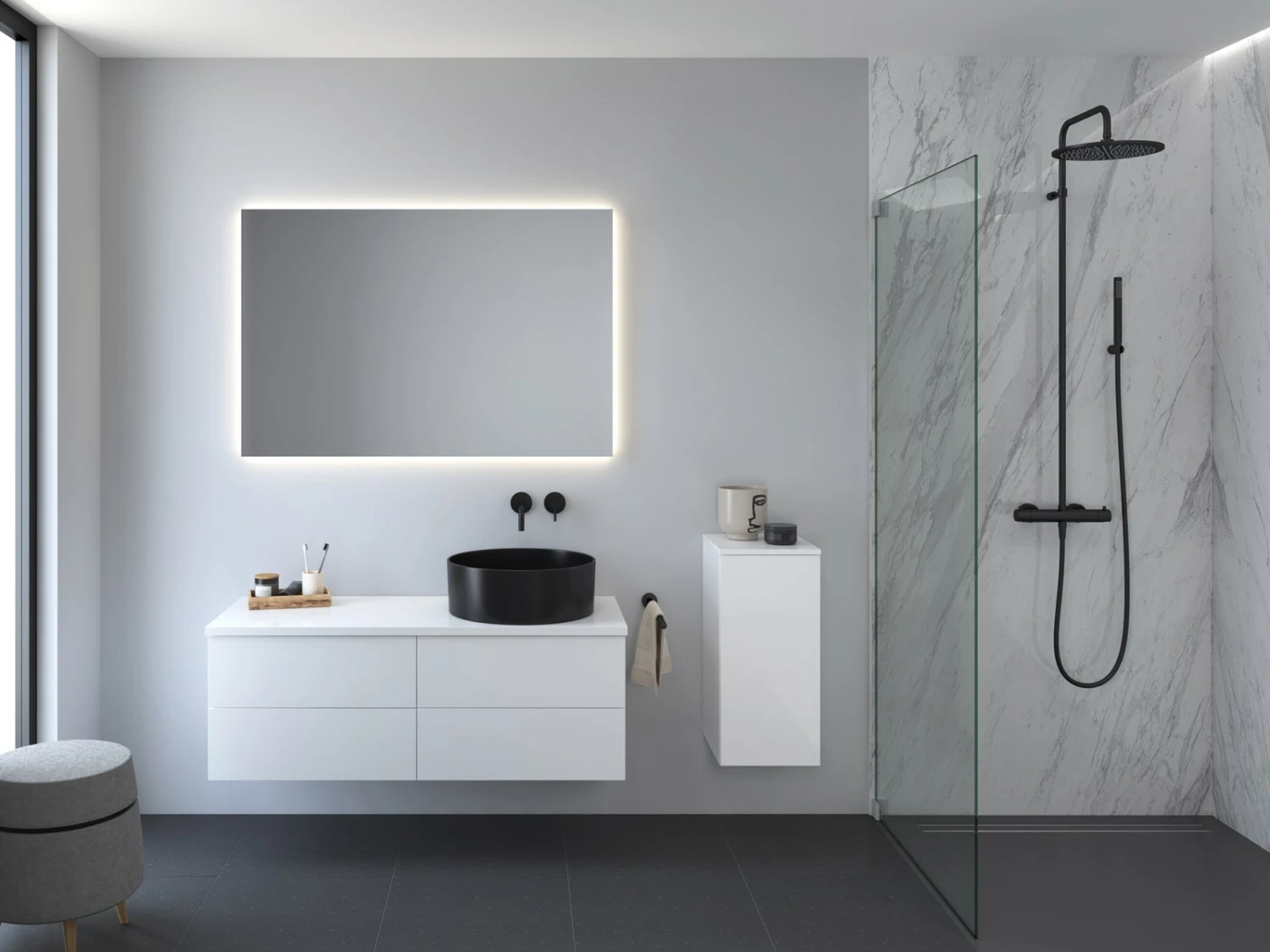 - Front: MDF-Kern mit Melaminharzdirektbeschichtung, Vorderseite zusätzlich mit einem einschichtigen Hochglanz UV-Acryllack beschichtet, Kanten umlaufend mit einer glänzenden Kunststoffdickkante belegt