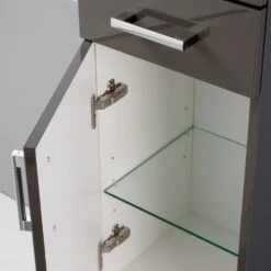 Die Innenausstattung ist grundsätzlich gedämpft und beinhaltet Blum ANTARO-Schubkästen sowie Auszüge in oriongrau als Vollauszüge mit farblich abgestimmtem Kosmetikeinsatz.