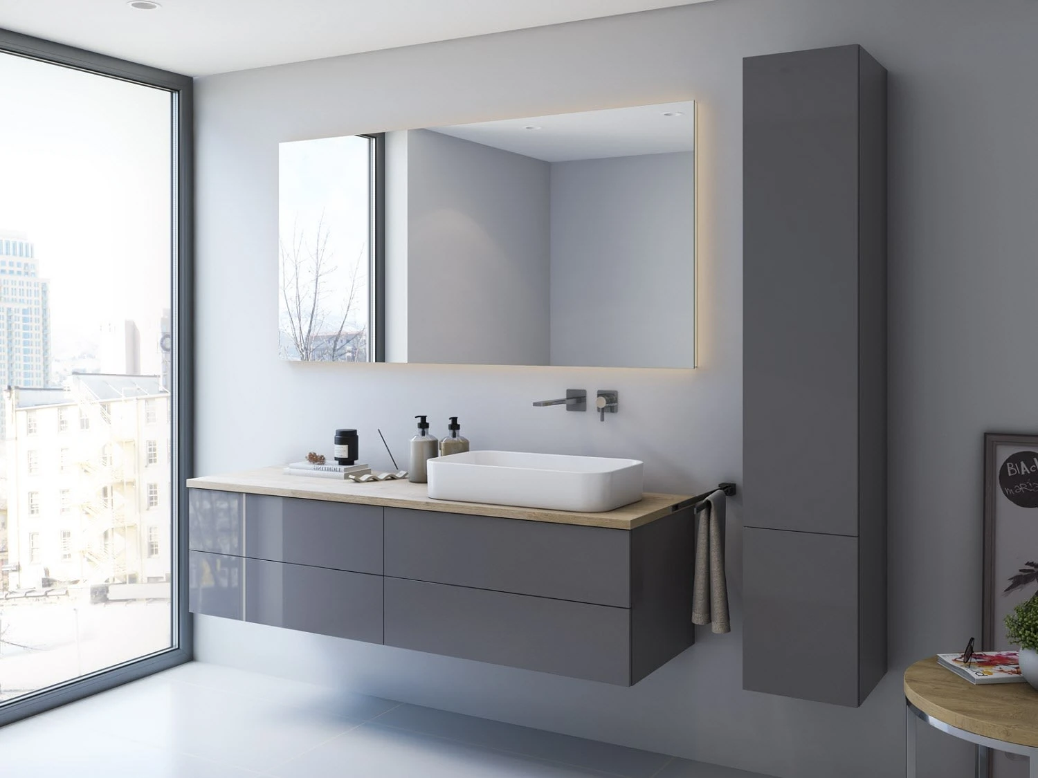 Die Innenausstattung ist grundsätzlich gedämpft und beinhaltet Blum ANTARO-Schubkästen sowie Auszüge in oriongrau als Vollauszüge mit farblich abgestimmtem Kosmetikeinsatz.